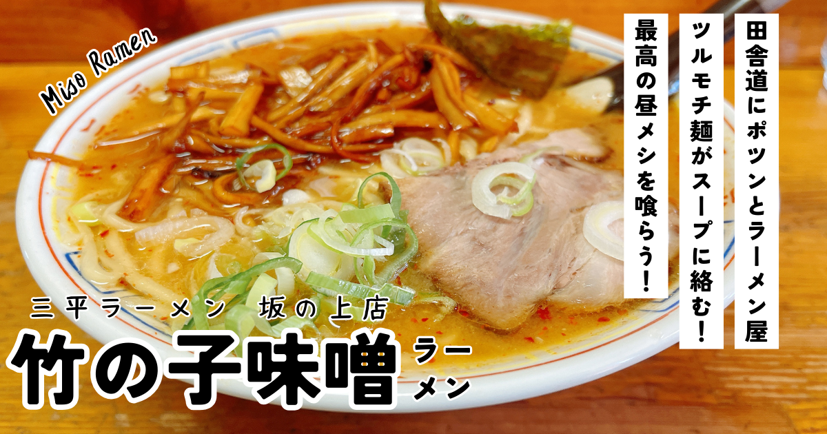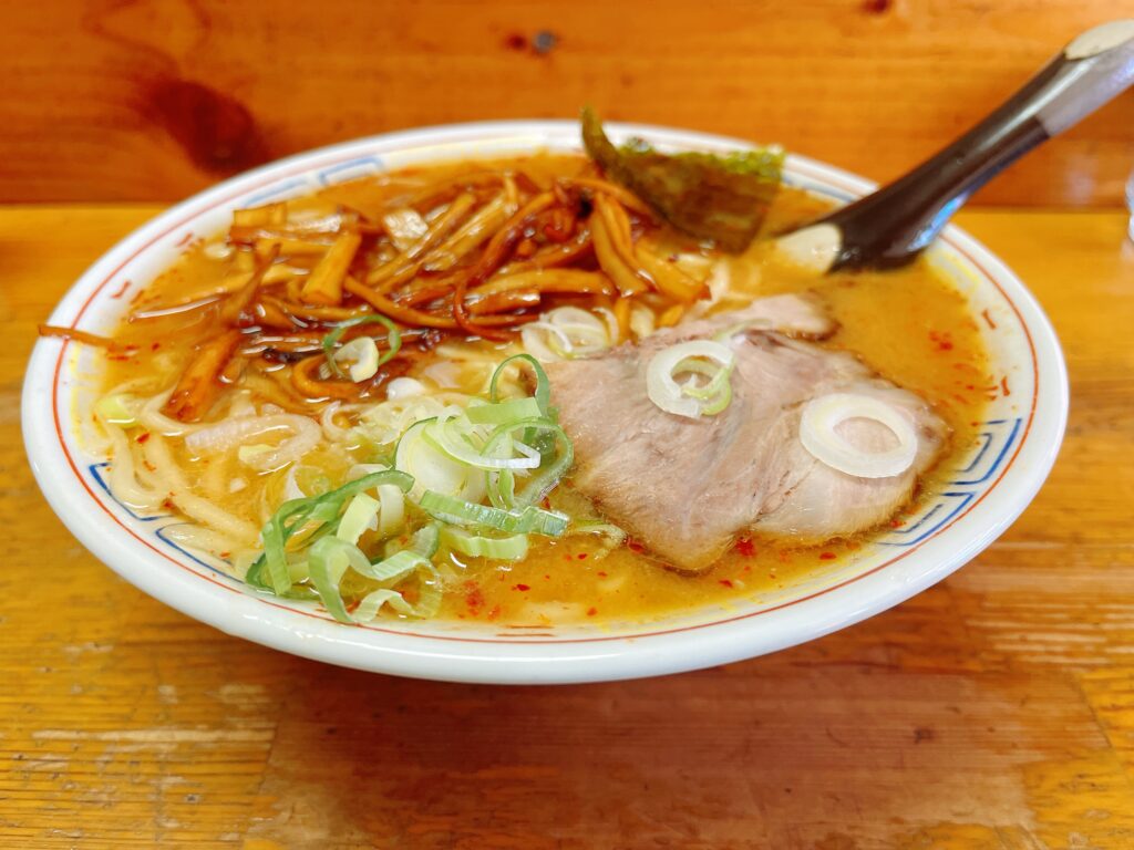 店内は約10席ほど。店主ひとりでラーメンを作るため、混雑時は提供時間が長くなります。三平ラーメンといえば竹の子!ということで「竹の子味噌ラーメン」で注文しました!三平ラーメンのうどんみたいに長い麺がいいんだよな〜!と思い出しながら待つこと10分。